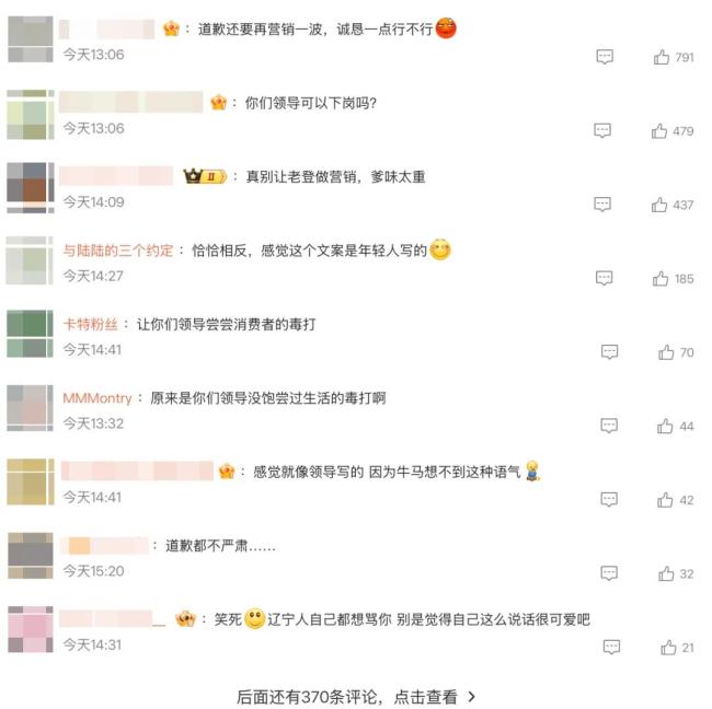 “道歉还要再营销一波,诚恳一点行不行”“真别让老登做营销,爹味太重”“笑死[微笑]辽宁人自己都想骂你别是觉得自己这么说话很可爱吧”……