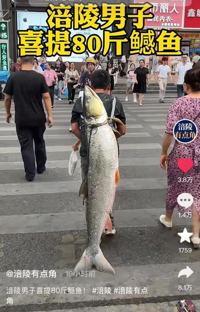 男子背着钓到的79斤鳡鱼在闹市穿行 高光时刻引围观