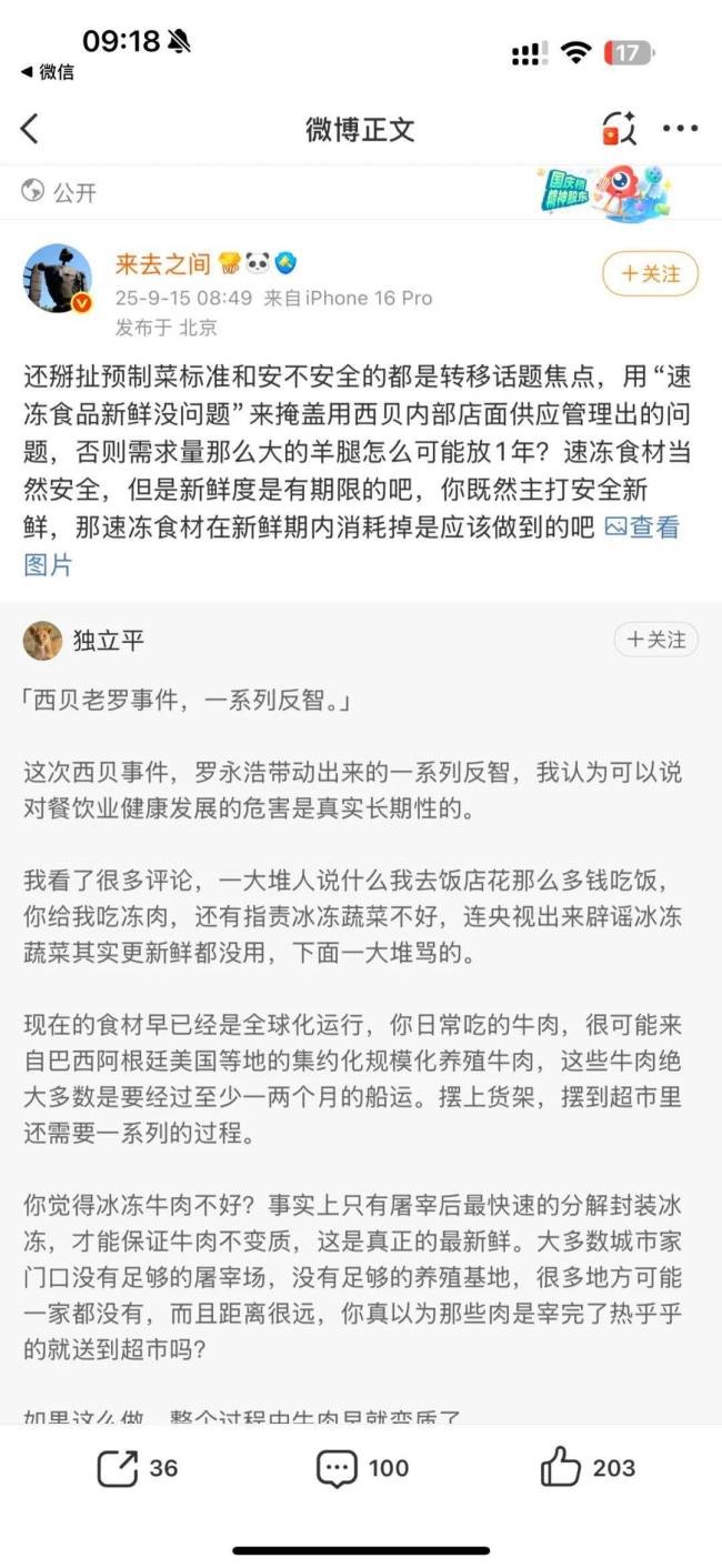 来去之间转发了网友“独立平”的文章,直指争议核心。文章认为,部分人试图通过强调预制菜标准的安全性来转移视线,实则掩盖了西贝在内部店面供应管理上的漏洞。文章指出,速冻食材的安全性虽无争议,但新鲜度存在明确期限。若企业主打“安全新鲜”的卖点,理应在食材新鲜期内完成消耗,而非以标准为借口回避管理问题。