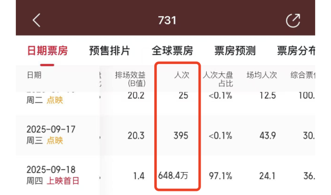 除票房表现外,《731》在排片方面同样显示出压倒性优势,今日排片占比高达70%,票房占比更是达到97%。这意味着今日电影市场几乎全部票房收入均来自该片。