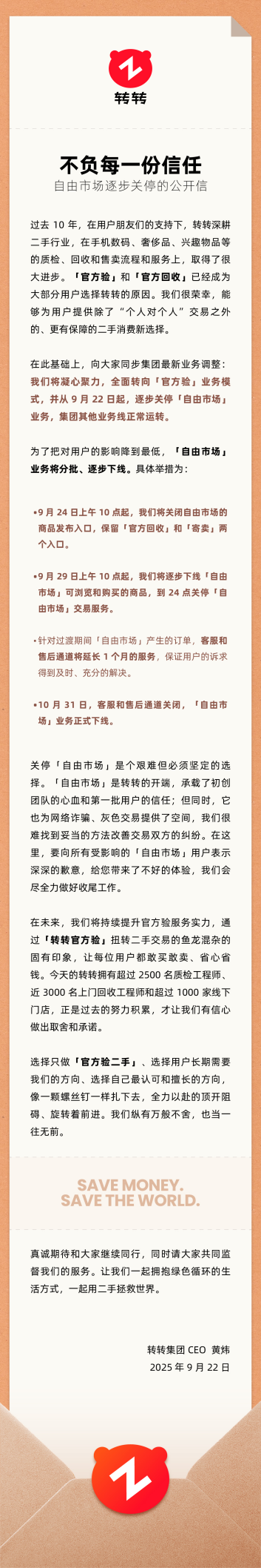 以下为转转集团CEO黄炜致用户信全文:
