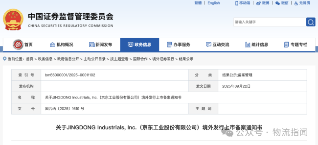 9月22日,中国证监会国际合作司发布关于JINGDONG Industrials,Inc.(京东工业股份有限公司)境外发行上市备案通知书,确认其通过境内运营实体北京京东数智工业科技有限公司提交的备案材料已收悉。根据备案文件,京东工业拟发行约2.533亿股普通股,并在香港联合交易所主板挂牌上市。