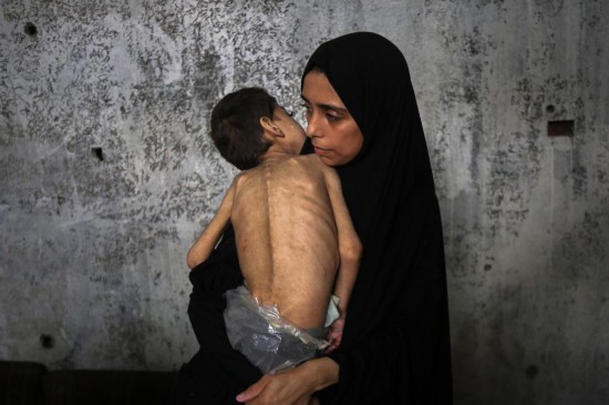 7月25日,在加沙城一处避难所,一名女子怀抱营养不良并患病的儿童。新华社发(里泽克·阿卜杜勒贾瓦德摄)