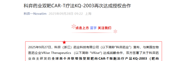 9月27日,科弈药业宣布,与美国生物医药企业VRise Therapeutics 达成战略合作,双方就全球首个并联增强型双靶向CAR-T细胞治疗产品KQ-2003(靶向BCMA/CD19)签署独家印度区域授权许可协议。