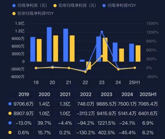 亚威股份2021年以来的净利润也基本是同收入同样的波动趋势,2022年扣非净利润还亏损了3000多万。今年上半年净利润7,065.4万元,同比增长6.9%。