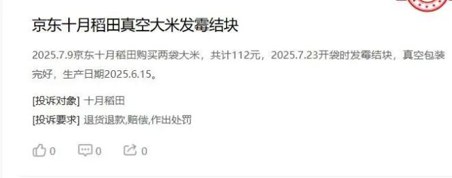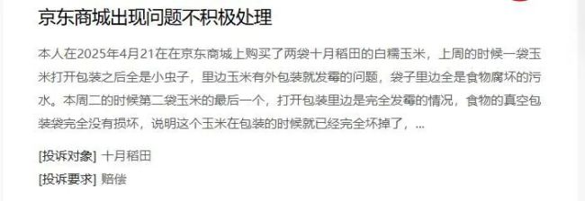 还有一位消费者投诉称,2025年8月2日在抖音商城十月稻田旗舰店购买2袋玉米,打开后发现玉米已经发霉变质。