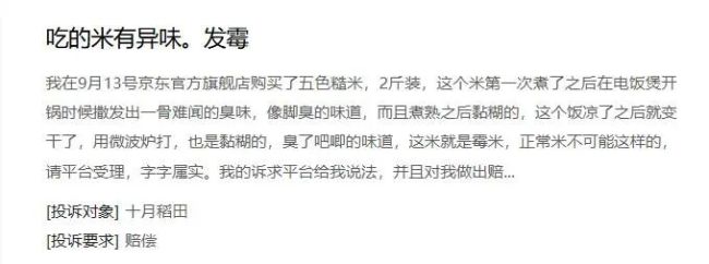 9月22日,一消费者投诉称,9月13日在京东十月稻田官方旗舰店购买的五色糙米有异味、发霉等情况。