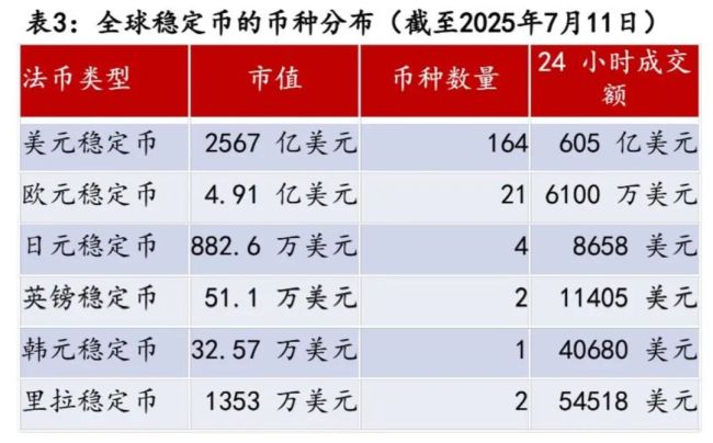 全球市场中以美元稳定币为主导,全球99%的稳定币锚定美元,底层资产绝大多数为美国国债。其中,USDT(Tether)和USDC(Circle)两大美元稳定币合计占全球稳定币总市值的九成。