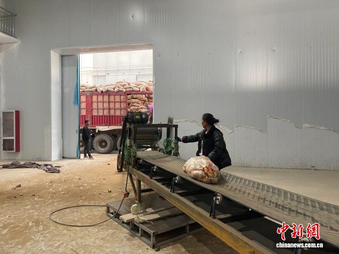 图为工人将马铃薯输送至恒温仓储库内。王旭 摄