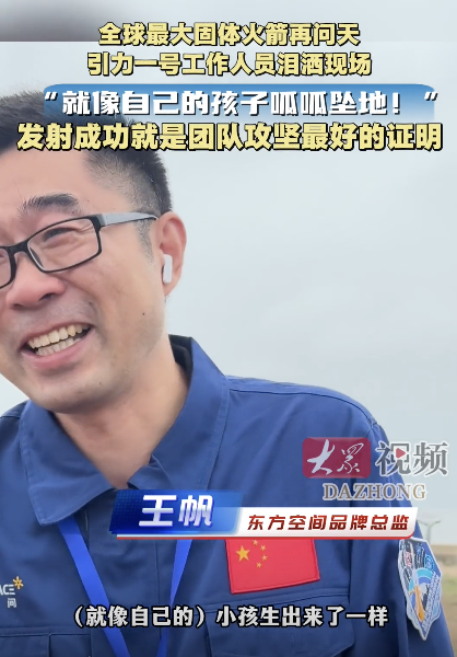 海上火箭发射成功一瞬工作人员哭了。10月11日上午10时20分,橘红色的火焰磅礴喷发,推动火箭拔地而起。全球最大固体运载火箭“引力一号”(遥二)在山东海阳附近海域发射成功。“胜利”消息传来,在发射现场亲眼见证火箭穿云破雾问天的东方空间品牌总监王帆喜极而泣,忍不住流下激动的泪水:“真就像自己孩子出生一样。最后攻坚阶段持续了数周,各个团队加班加点,确保万无一失。我的心情跟我们团队每一个人都是一样的。这枚火箭发射凝聚了大家一年多的心血,每一个岗位都没有掉链子,今天发射圆满成功就是最好的证明。”