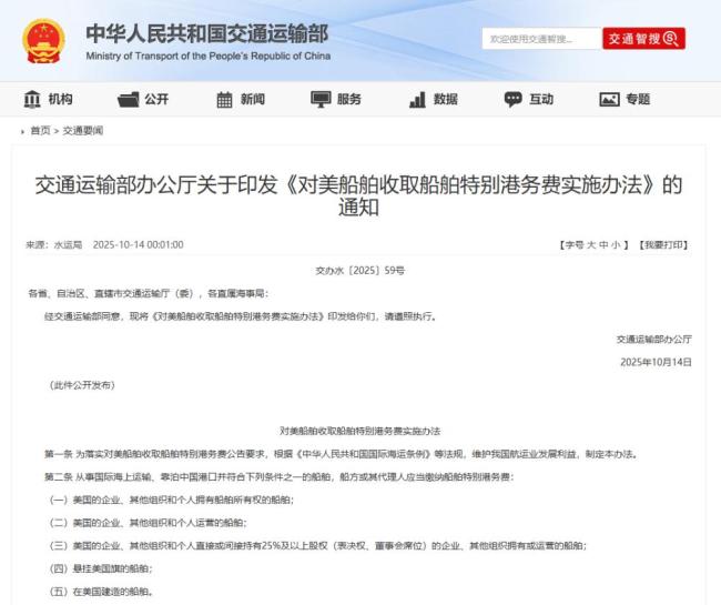交通运输部办公厅发布了《对美船舶收取船舶特别港务费实施办法》的通知,要求各省、自治区、直辖市交通运输厅(委)及各直属海事局遵照执行。该通知于2025年10月14日公开发布。