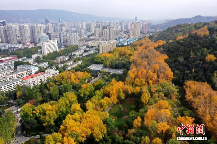 10月16日,航拍青海省西宁植物园。随着气温不断降低,西宁市彩叶树木层林尽染,吸引不少市民前来赏秋。 (无人机照片)张忠苹 摄