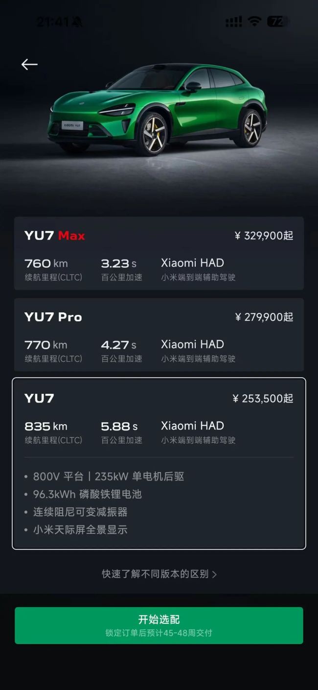 转单市场之所以火爆是因为小米汽车提车周期过长,以YU7为例,当前预定标准版YU7车型最晚需要48周才能交付,也就是近1年时间。