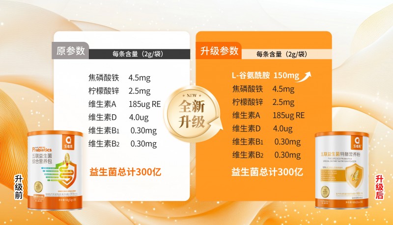 五联益生菌特膳营养粉在保留原有优质益生菌菌株的基础上,将L-谷氨酰胺提升至150mg,守护幼儿童肠道健康;