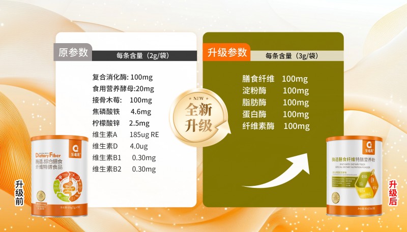 酶适膳食纤维特膳营养粉从原有的2g/袋升级为3g/袋,蛋白酶、纤维素酶等复合消化酶含量提升至100mg,搭配膳食纤维与多种维生素,助力改善儿童积食脾虚问题;