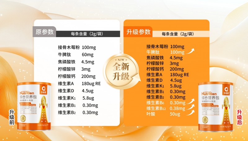 综合营养包将牛脾肽含量提升至100mg,同时新添0.30mg维生素B6、0.38mg维生素B12以及50ug叶酸等重要营养素,进一步强化了营养补充的全面性;