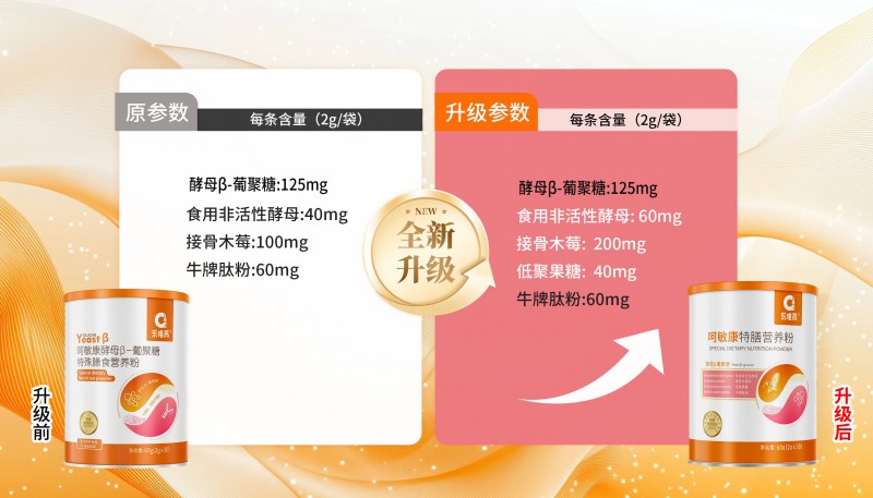 呵敏康特膳营养粉则将接骨木莓含量从100mg提升至200mg,食用非活性酵母含量同步增加,搭配酵母β-葡聚糖与牛脾肽粉,为过敏体质幼儿童构筑天然防护屏障;