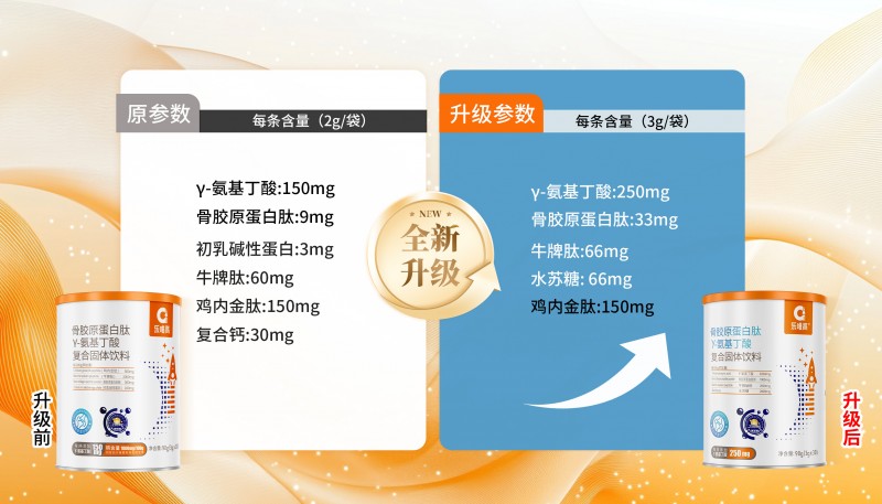 骨胶原蛋白肽γ-氨基丁酸复合粉不仅将核心成分γ-氨基丁酸含量从150mg提升至250mg,更增加了骨胶原蛋白肽与牛脾肽含量,为幼儿童骨骼发育与生长发育提供有力支持。