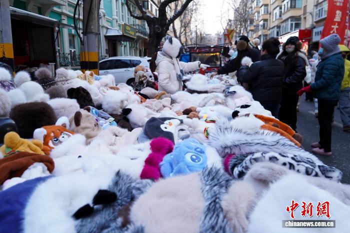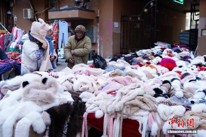 12月2日,黑龙江哈尔滨,在街头售卖的各种帽子。当日,黑龙江哈尔滨最高气温今冬首次降到-10℃以下 ,在哈尔滨红专街早市,棉帽子、大花袄等保暖物品摆上街头,游人纷纷选购。中新社记者 赵宇航 摄
