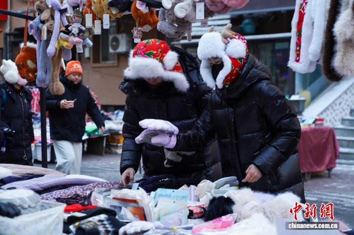 12月2日,黑龙江哈尔滨,游人选购保暖衣物。当日,黑龙江哈尔滨最高气温今冬首次降到-10℃以下 ,在哈尔滨红专街早市,棉帽子、大花袄等保暖物品摆上街头,游人纷纷选购。中新社记者 赵宇航 摄