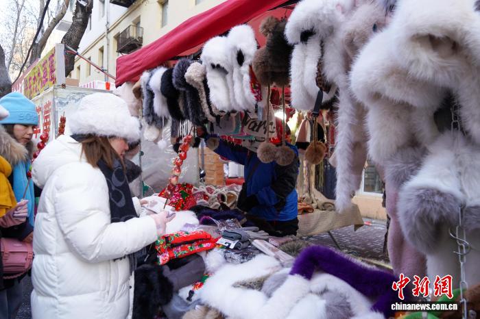 12月2日,黑龙江哈尔滨,游人试戴保暖物品。当日,黑龙江哈尔滨最高气温今冬首次降到-10℃以下 ,在哈尔滨红专街早市,棉帽子、大花袄等保暖物品摆上街头,游人纷纷选购。中新社记者 赵宇航 摄