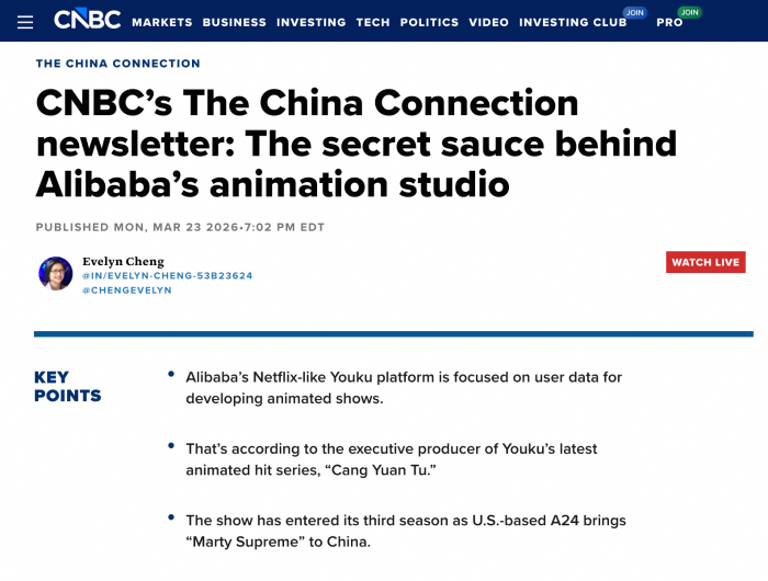 国际主流商业媒体CNBC近日发表了关于优酷年番《沧元图》开播及国漫出海的报道,该报道发布在CNBC官网及App,作为最新一期聚焦中国商业新闻的《The China Connection》newsletter主推内容。报道指出,自2023年《沧元图》第一季播出以来,其在优酷的在追人数已超过990万。