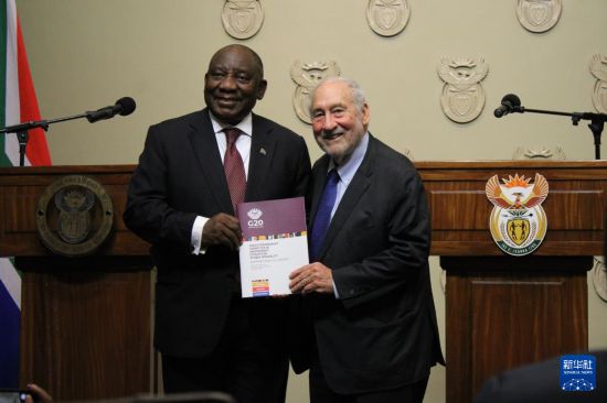 11月4日,在南非立法首都开普敦,二十国集团应对全球不平等问题特别独立专家委员会主席、诺贝尔经济学奖得主约瑟夫·施蒂格利茨(右)向南非总统拉马福萨提交关于全球不平等问题的报告。新华社发(沙姬拉·泰比摄