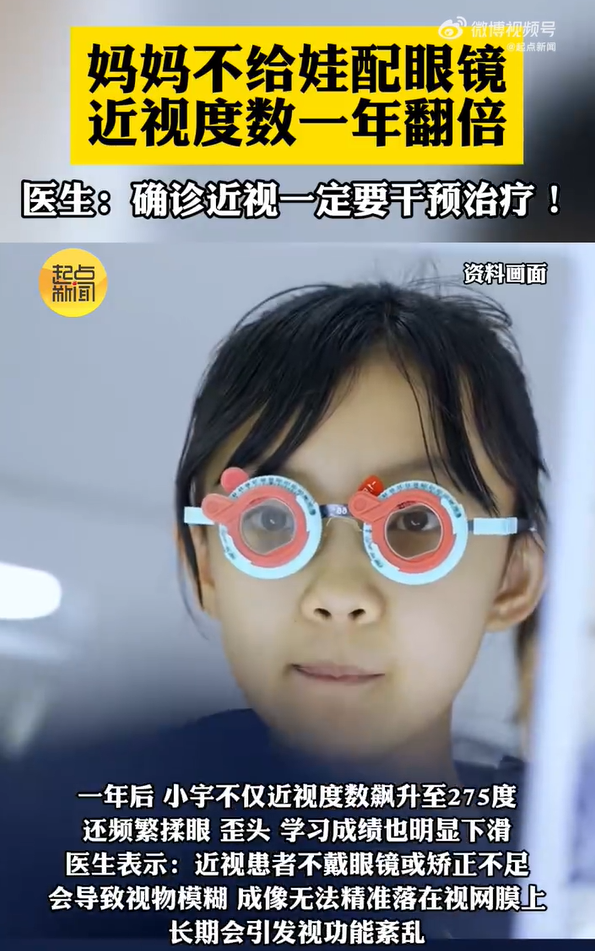 近日,陕西西安一则关于“妈妈不给孩子配眼镜导致近视度数翻倍”的新闻,引发社会热议。事件的主角是年仅9岁的小宇——原本只有轻度近视,却因家长的“误区式爱护”,一年间度数暴涨近两倍,视力问题愈发严重。担心“越戴越深”,妈妈选择“观望”一年前,小...