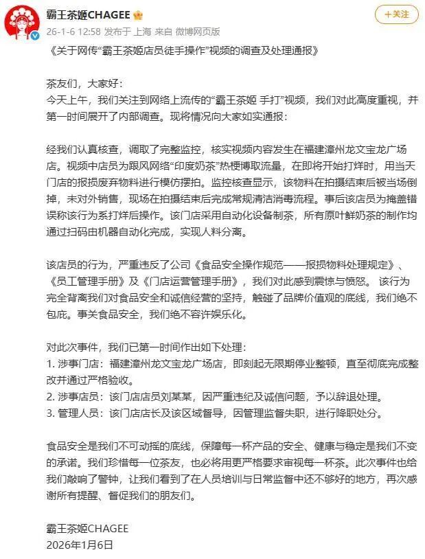 近日,一段关于“霸王茶姬店员徒手操作”的视频在网络上广泛传播,引起公众关注。1月6日,霸王茶姬官方发布了调查及处理通报,称该视频是在福建漳州一门店内拍摄的摆拍视频,所用物料为报损废弃品,并未对外销售。涉事门店已被无限期停业整顿