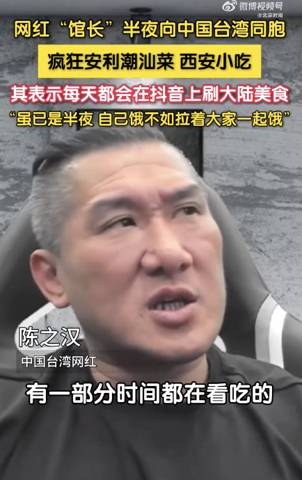 “馆长”半夜安利潮汕菜和西安小吃。9月7日晚,中国台湾网红“馆长”半夜向同胞们疯狂安利潮汕菜、西安小吃,其表示每天都会在抖音上刷大陆美食,虽已是半夜,自己饿不如拉着大家一起饿。“馆长”半夜安利潮汕菜和西安小吃...