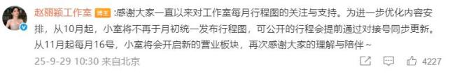 9月29日,赵丽颖工作室宣布调整行程发布方式。从10月起,工作室将不再于月初统一发布行程图,可公开的行程会提前通过对接号同步更新。从11月起,每月16号,工作室将会开启新的营业板块,感谢大家的理解与陪伴