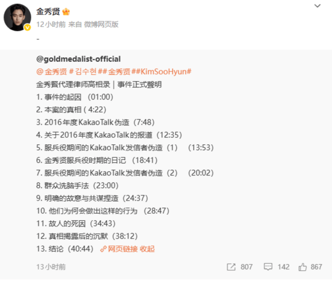 金秀贤转发律师视频声明 否认未成年交往传闻