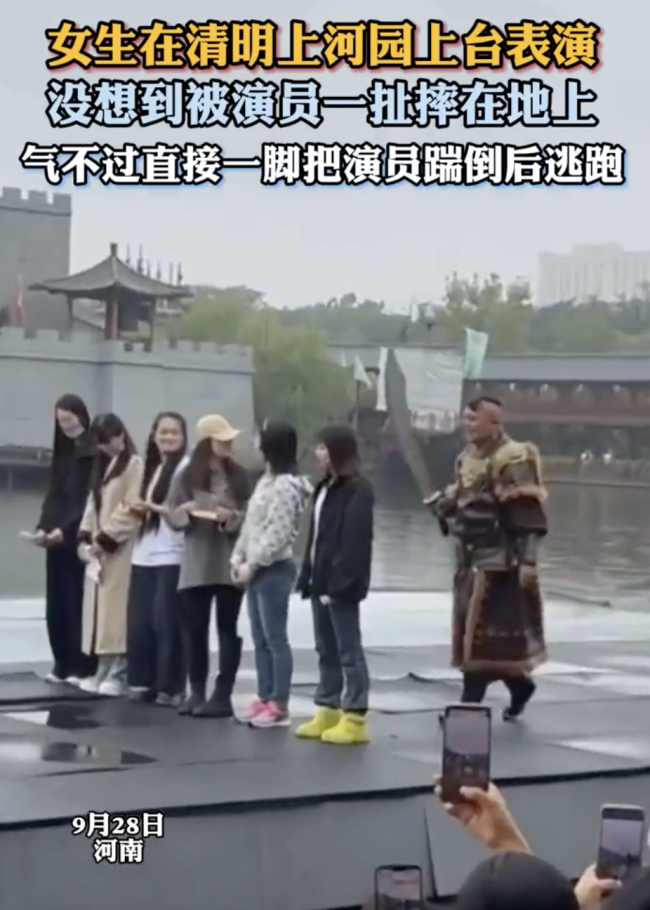 清明上河园:女生上台表演被演员扯摔在地上,