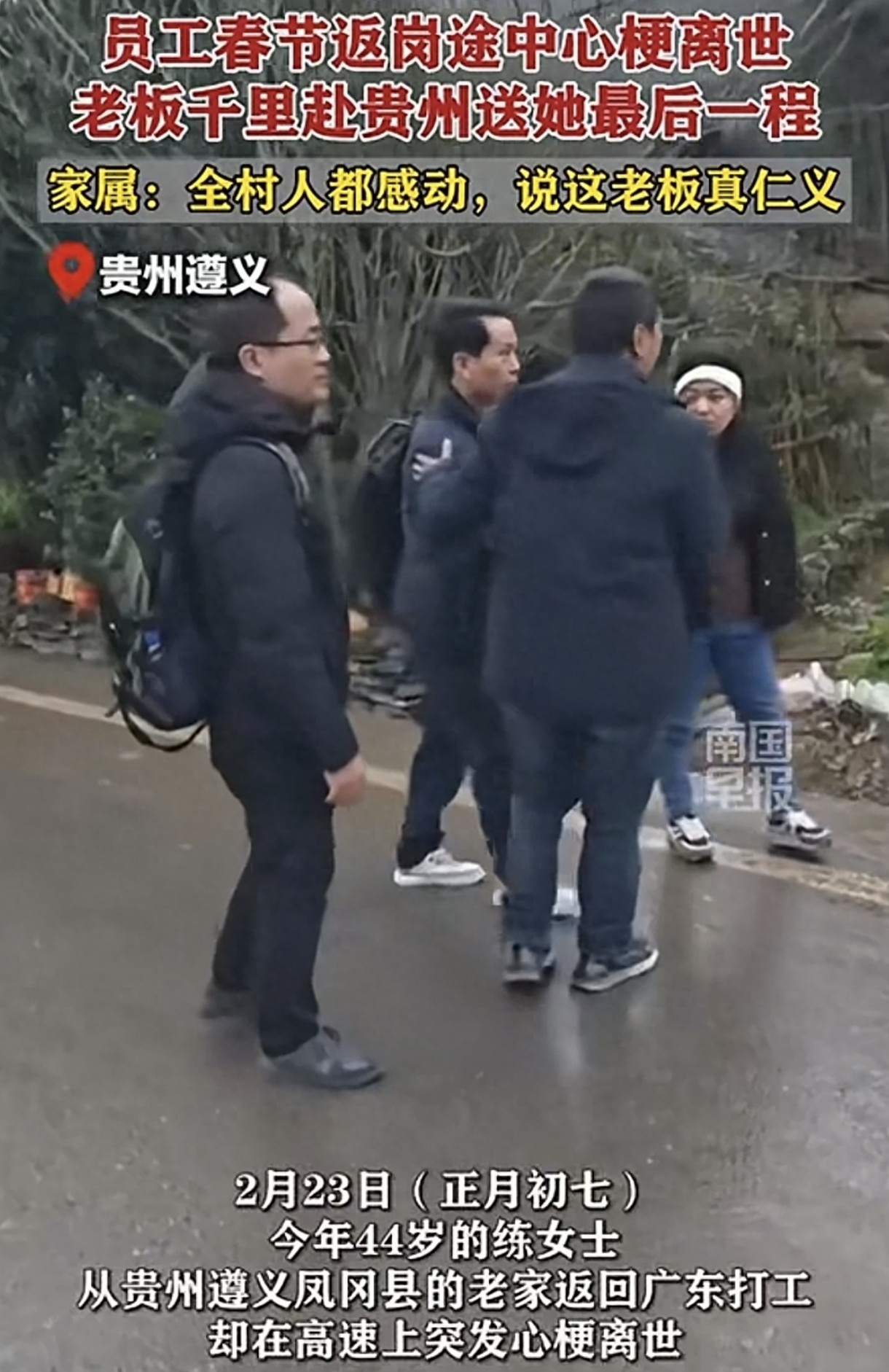 今年44岁的练女士春节后从贵州老家返回广东打工,途中在高速上突发心梗离世。出殡前,工厂老板和员工乘坐飞机并包车赶到练女士老家送她最后一程。医生诊断练女士为心肌梗死。村里人对老板的行为感到非常感动,称赞他为人很好